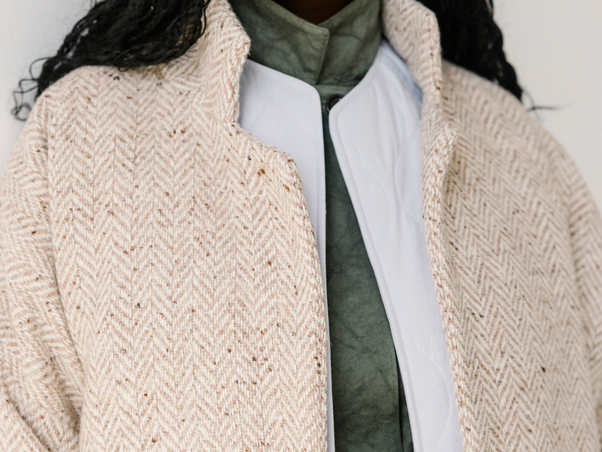 - Sandstone Herringbone: 62% wool, 23% acrylic, 12% polyester, 3% other fibres. Lining: 100% acetate.